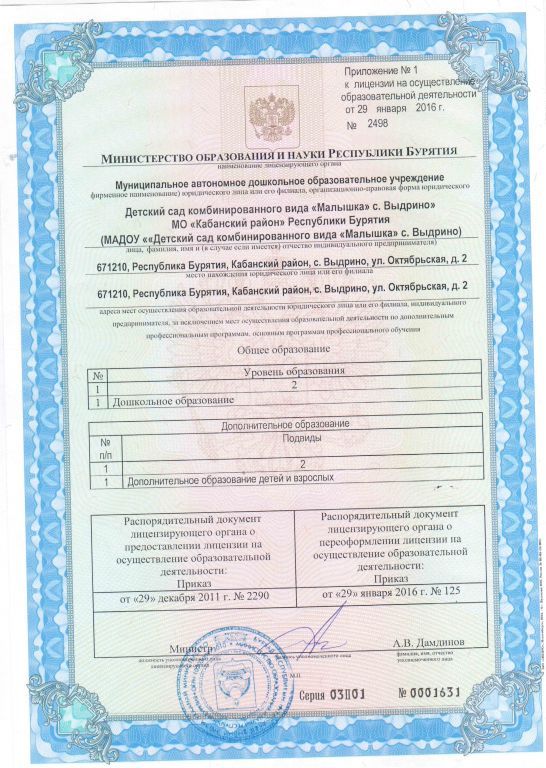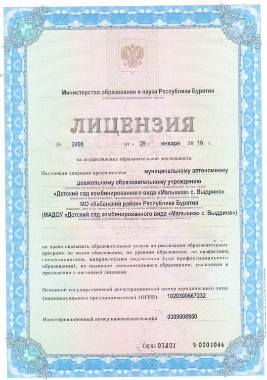 | Полное наименование образовательной организации* | Муниципальное автономное дошкольное образовательное учреждение "Детский сад комбинированного вида "Малышка" с. Выдрино" МО "Кабанский район" Республики Бурятия |