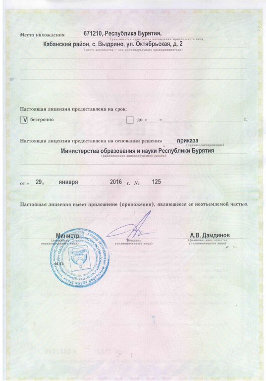 | Адрес местонахождения образовательной организации* | 671210 РБ, Кабанский район с. Выдрино ул. Октябрьская 2 |